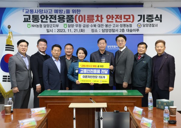 담양경찰서에 따르면 지난 21일 교통약자인 고령운전자의 주 이동수단인 사발이·이륜차·전동차 등의 운행증가로 인한 교통사고 증가 추세에 대비하여 농협중앙회 담양군지부 등 관내 농협 8개소와 협약을 맺고 교통안전용품 전달식을 가졌다.