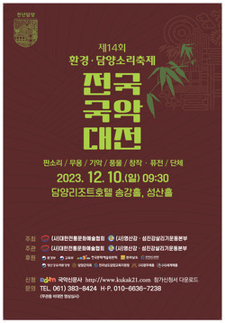 (사)대한전통문화예술협회와 (사)영산강섬진강살리기운동본부가 주최하는 제14회 환경담양소리축제 전국국악대전이 오는 12월 10일 담양리조트 호텔 대연회장(송강홀)과 소연회장(성산홀)에서 개최된다.
