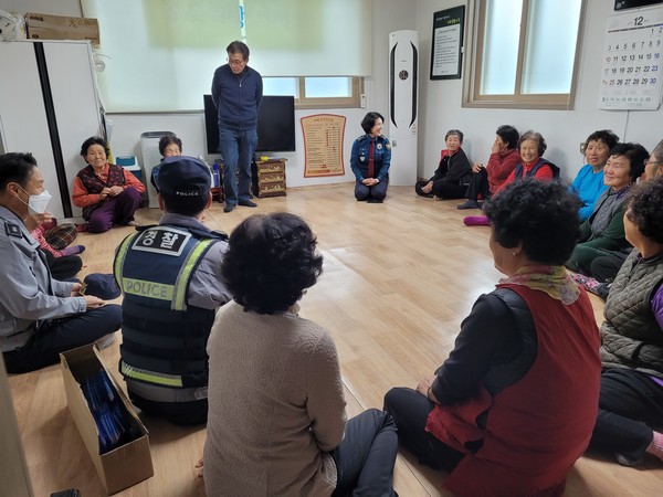 박송희 담양경찰서장이 12일 마을 담당 경찰관(이하 한걸음 순찰) 제도와 관련해 수북면 주평리 주평마을회관을 방문하고 주민들과 소통의 시간을 가졌다.