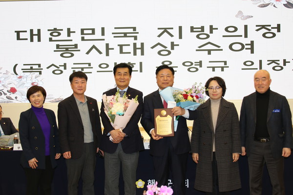 곡성군의회 윤영규 의장이 최근 부산 웨스틴 조선호텔에서 열린 대한민국시군자치구의회의장협의회에서‘지방 의정 봉사대상’을 수상하는 영예를 안았다.
