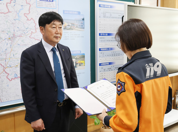 담양소방서는 지난 7일 목욕탕에서 의식을 잃고 쓰러진 심정지 환자를 소생시키는데 기여한 공이 큰 송진현 담양군산림조합장에게 소방서장 표창을 수여했다.