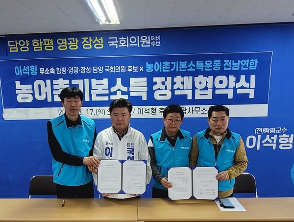 이석형 무소속 담양·함평·영광·장성 예비후보는 지난 17일 농어촌기본소득운동전남연합과 이석형 예비후보 선거사무소에서 정책협약식을 가졌다.