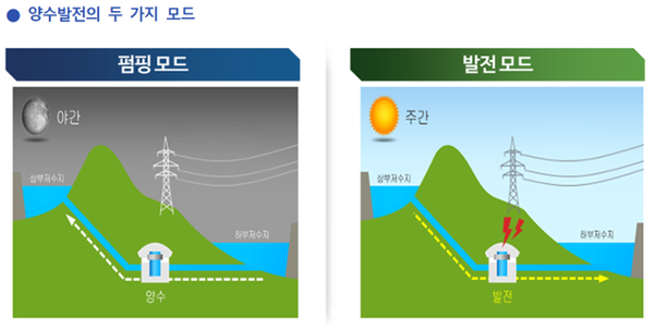 양수발전은 다른 발전 시설에서 생산한 잉여 전력으로 하부댐의 물을 상부댐까지 끌어올렸다가 전력 수요가 많은 시간대에 물을 흘려보내 전력을 생산하는 발전 방식이다.