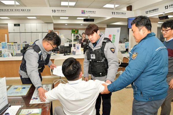 모의훈련은 나날이 증가하는 악성 민원인의 폭언과 폭행 등으로부터 공무원을 보호하고 방문 민원인의 2차 피해 발생 예방 및 현장 대응능력 향상을 위해 추진됐다.