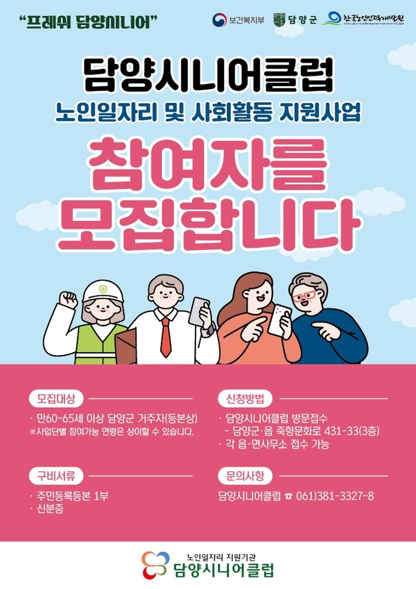 담양시니어클럽(관장 이웅철)이 2025년도 노인일자리사업 및 사회활동 지원사업 참여자를 모집한다.
