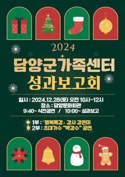 이번 성과보고회는 올 한 해 동안 추진한 사업의 성과를 공유하고 격려하는 자리로 식전 공연 난타를 시작으로 담양군 가족센터의 성과보고 이후에는 스타 강사 강은미의 행복특강과 초대가수 박강수 씨의 특별 공연으로 송년을 보내는 길목에서 가족 모두가 소통하며 참여할 수 있는 힐링타임을 갖게 된다.