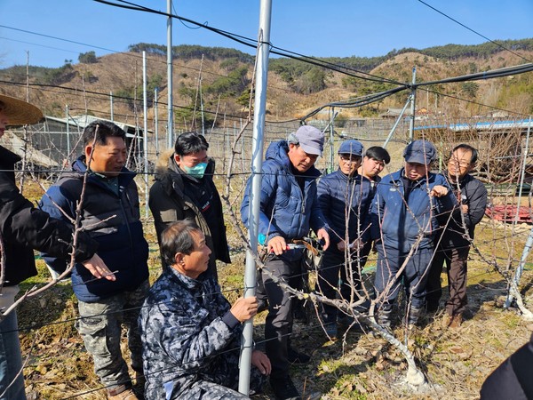 곡성군은 지난 14일 고품질 사과 생산을 위한 다축 동계전정 현장 교육을 추진했다.