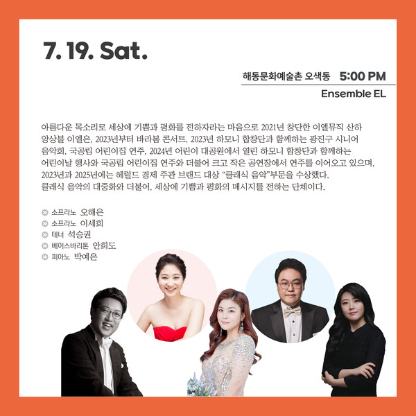 이번 어쿠스틱 인 해동 공연에 출연하는 Ensemble EL은 클래식 음악 대중화와 앞장서고 있는 성악가들이 모인 단체로, 2025 헤럴드 경제 주관 ‘클래식 음악’부문 브랜드 대상을 수상한 테너 석승권과 소프라노 오해은이 함께한다.