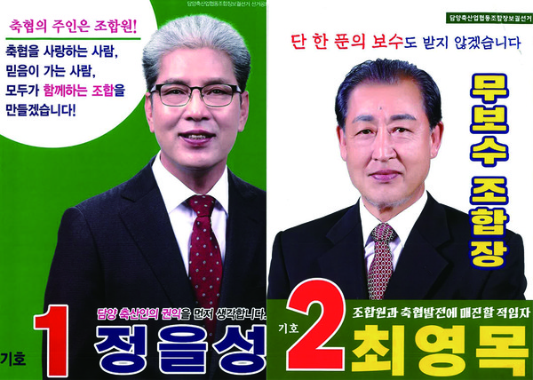 조합원들이 선택할 수 있는 출구전략은 ‘담양 축산인의 권익을 먼저 생각합니다’를 기치로 내건 기호 1번 정을성 후보와 ‘조합원과 축협발전에 매진할 적임자’를 주창하고 나선 기호 2번 최영목 후보.