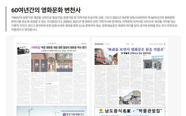 특히 본지는 1960년대 담양극장 개관을 시작으로 명성극장, 창평극장 등 극장 전성기와 쇠퇴를 비롯 2021년 개관한 담빛시네마까지 60여년간의 영화 문화 변천사를 한눈에 조망 할 수 있도록 영화관 관련 기획기사를 통해 세대별 기억을 잇는 기록적 가치를 제고하고 작은영화관 개관을 통한 도농 문화격차 해소, 문화예술공간 재생 의미를 담아 과거와 현재를 잇는 전시콘텐츠를 홍보전시관에서 펼쳐 보여 눈길을 끌었다.