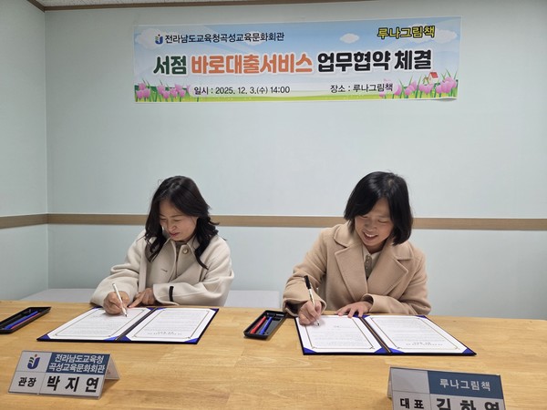 곡성교육문화회관(관장 박지연)은 곡성읍 독립서점 루나그림책에서‘서점 바로대출서비스’운영을 위한 업무 협약을 체결했다.