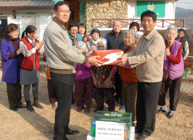 계속되는 경기 한파로 기부 행렬이 뜸해진 요즘 담양군의 한 과일영농조합이 시가 500만원 상당의 과일을 기부해 눈길을 끌고 있다.(사진)