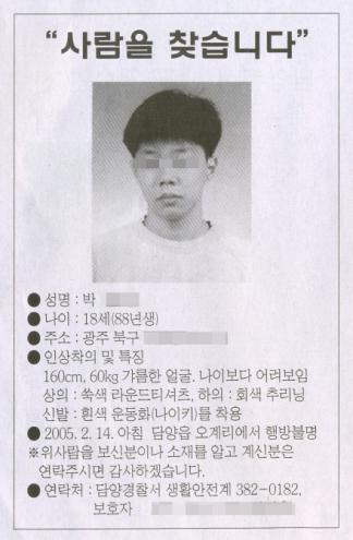 4년전인 2005년 2월, 담양지역 곳곳에 고교생 박 모 군을 찾는다는 현수막과 함께 수천장의 전단이 뿌려졌다.(사진)