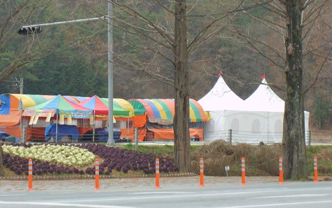 가로수 길 입구에 턱하니 자리 잡고 있는 울긋불긋 포장마차. 경치와 전혀 어울리지 않을 뿐만 아니라 가로수 길의 경치를 심하게 훼손하고 있다는 것이 주민들의 지적이다.