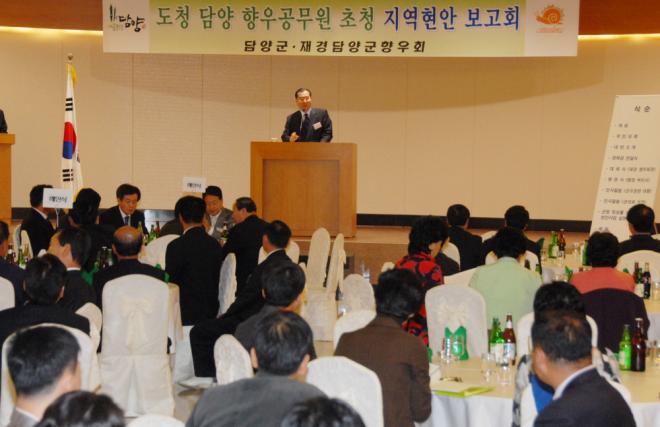 담양군과 재경담양군향우회(회장 김동호)는 지난 15일 목포 신안비치호텔에서 전남도청에 근무하는 담양향우 공직자를 초청, 지역현안보고회를 통해 상생 협력 관계를 형성하고 담양 발전 자문과 긴밀한 지원 협의 체제를 구축하는 계기를 마련했다.