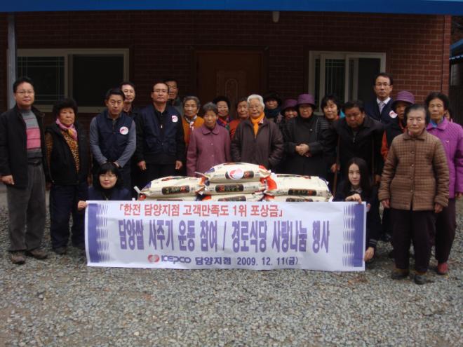 한전 담양지점(지점장 서상엽)은 한전 본사에서 실시한 고객만족도 조사에서 1위를 차지해 수상한 포상금으로 담양 쌀을 구입, 연말연시 소외된 이웃들에게 전달하는 사랑나눔 봉사활동을 펼쳤다.