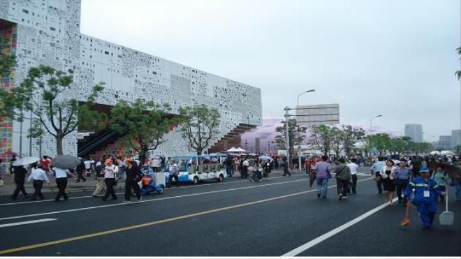 광활한 구역에서 운행되고 있는 모든 버스와 황포강을 건너는 배는 모두 무료로 이용되고 있었으며 시간적인 여유 속에 볼 수 있도록 잘 갖추어져 있었다. 수많은 차량과 유람선이 터널과 강 위를 오가며 부지런히 관람객을 실어 나르고 있는데도 불구하고 가는 곳마다 만원이었다. 특히 버스와 배를 타는 곳, 관람석에 입장하는 곳, 물건을 사는 곳, 조그마한 쉼터 공간 등에는 어김없이 기다리는 사람들로 줄이 끝없이 이어졌다.
